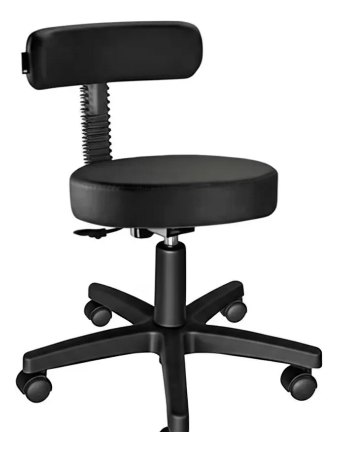 banco giratório com encosto, ajuste de altura através de sistema a gás, assento com espuma injetada de alta densidades, revestimento tecido automotivo, base em aço com 5 pés com rodízios com duplo giro, acabamento empolipropileno de alta resistência. Dimensões: diâmetro assento: 34 cm,medidas do encosto: 38 cm de largura e 10 cm de altura, altura mínima do chão ao assento: 44 cm e altura máxima do chão ao assento: 56 cm,